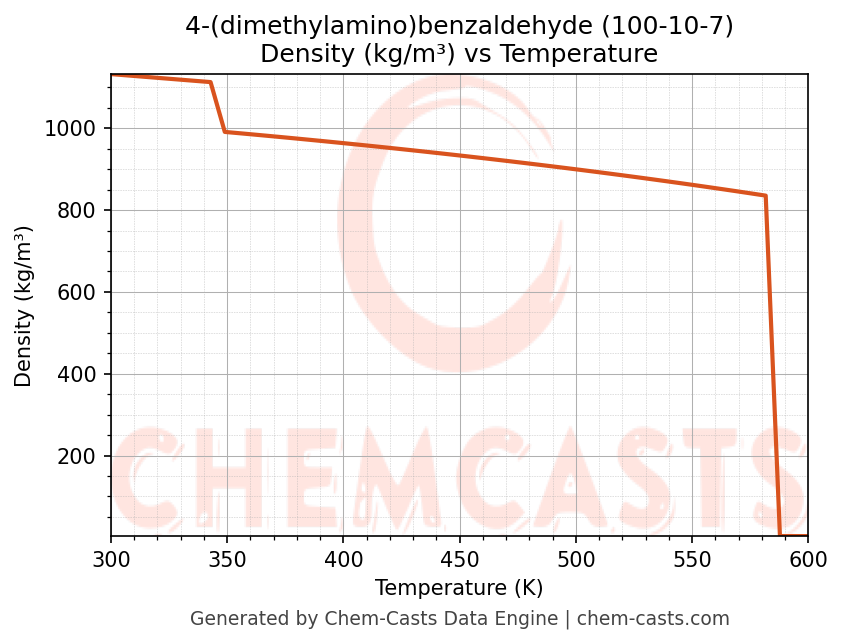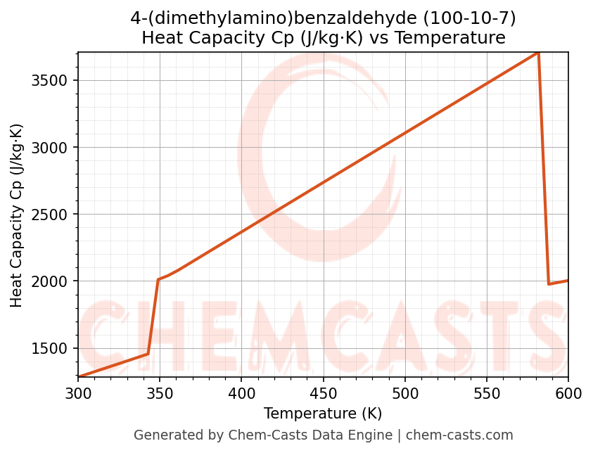 - Specific heat capacity (Cp) indicates the amount of energy required to raise the temperature of 4-(dimethylamino)benzaldehyde and is critical for energy balance and heat-exchanger design.
