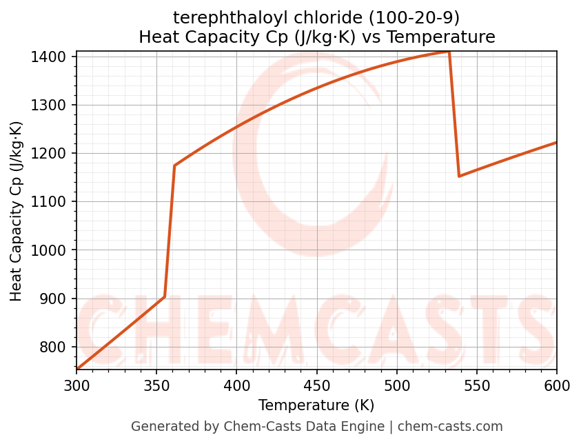 - Specific heat capacity (Cp) indicates the amount of energy required to raise the temperature of terephthaloyl chloride and is critical for energy balance and heat-exchanger design.
