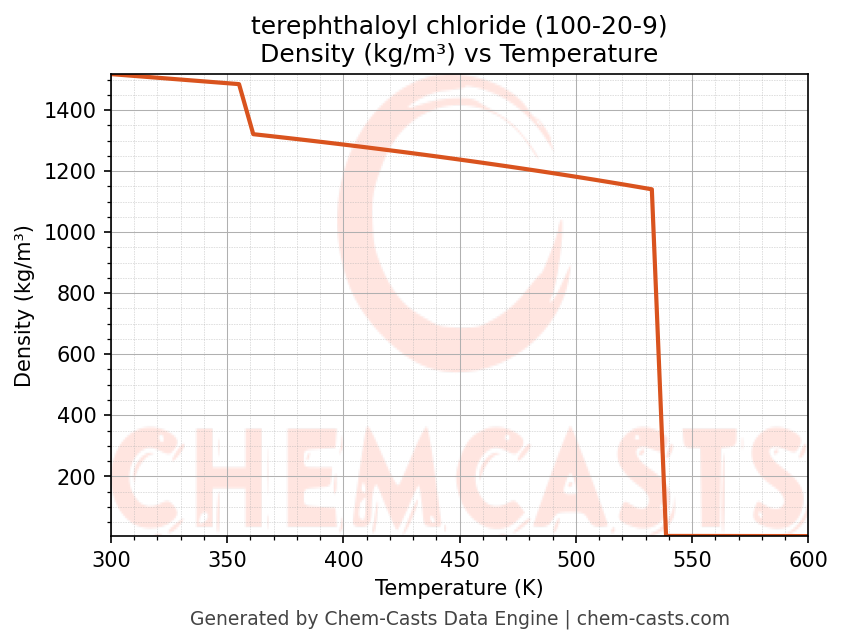 This page presents the temperature-dependent thermodynamic and transport properties of terephthaloyl chloride (CAS 100-20-9) calculated at a constant pressure of 1 atm (101325 Pa) over the temperature range 250-500 K.