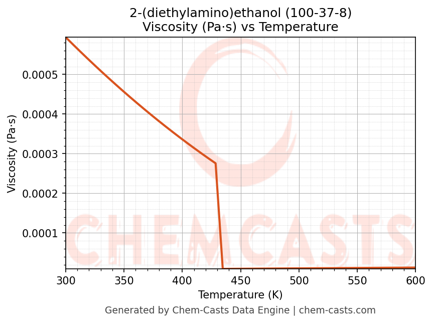 This page presents the temperature-dependent thermodynamic and transport properties of 2-(diethylamino)ethanol (CAS 100-37-8) calculated at a constant pressure of 1 atm (101325 Pa) over the temperature range 250-500 K.