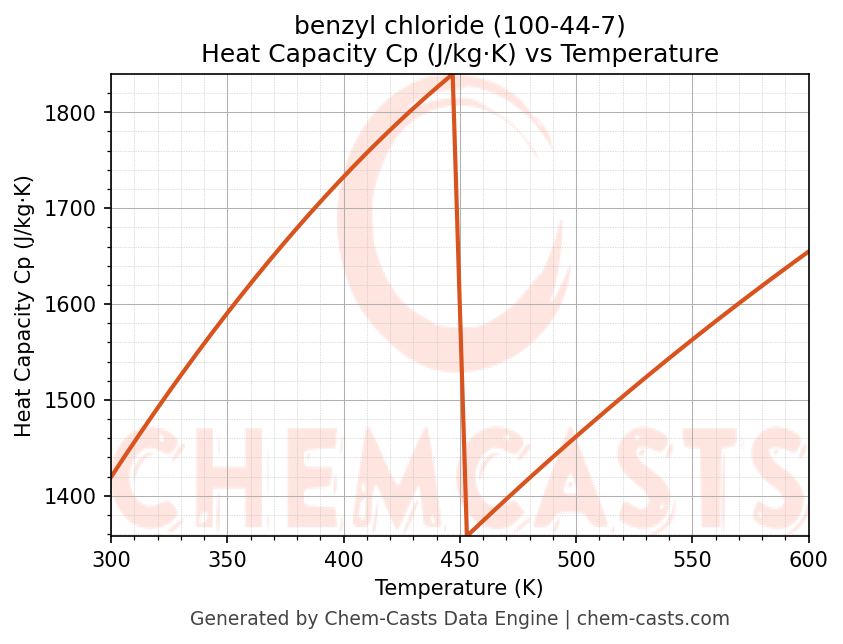 - Specific heat capacity (Cp) indicates the amount of energy required to raise the temperature of benzyl chloride and is critical for energy balance and heat-exchanger design.