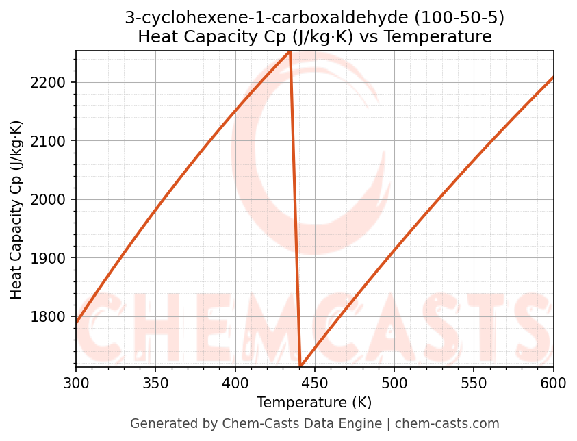- Specific heat capacity (Cp) indicates the amount of energy required to raise the temperature of 3-cyclohexene-1-carboxaldehyde and is critical for energy balance and heat-exchanger design.
