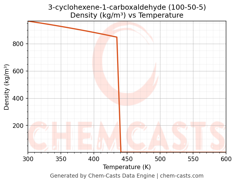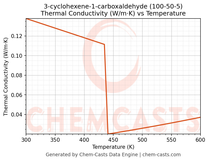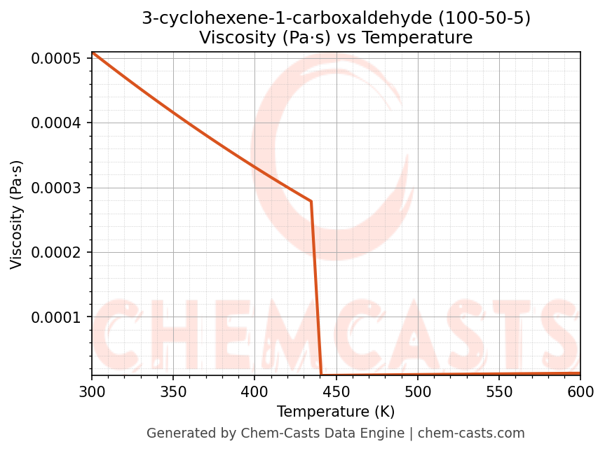 This page presents the temperature-dependent thermodynamic and transport properties of 3-cyclohexene-1-carboxaldehyde (CAS 100-50-5) calculated at a constant pressure of 1 atm (101325 Pa) over the temperature range 250-500 K.