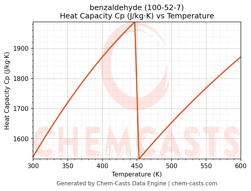 - Specific heat capacity (Cp) indicates the amount of energy required to raise the temperature of benzaldehyde and is critical for energy balance and heat-exchanger design.