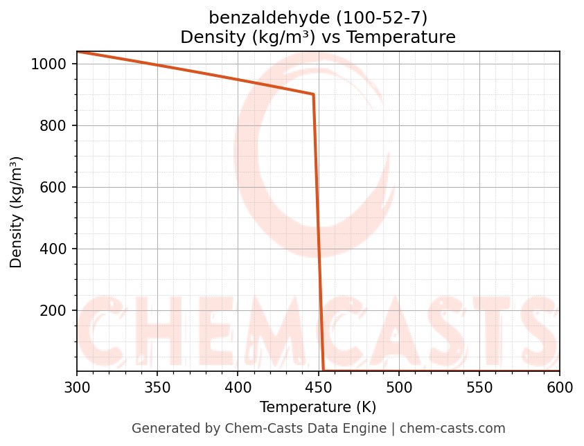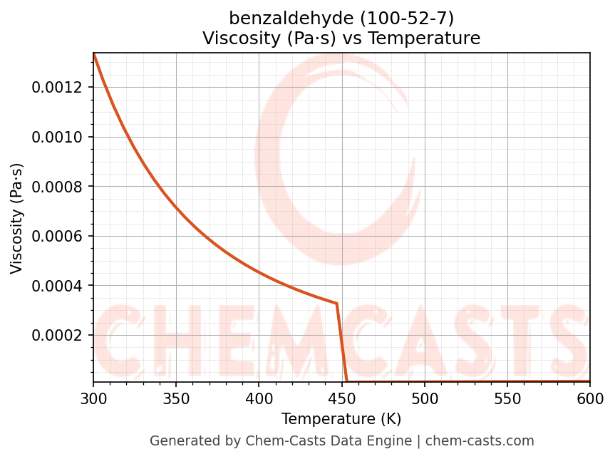 This page presents the temperature-dependent thermodynamic and transport properties of benzaldehyde (CAS 100-52-7) calculated at a constant pressure of 1 atm (101325 Pa) over the temperature range 250-500 K.