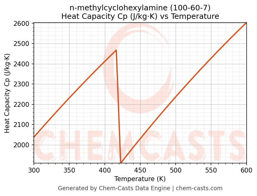 - Specific heat capacity (Cp) indicates the amount of energy required to raise the temperature of n-methylcyclohexylamine and is critical for energy balance and heat-exchanger design.