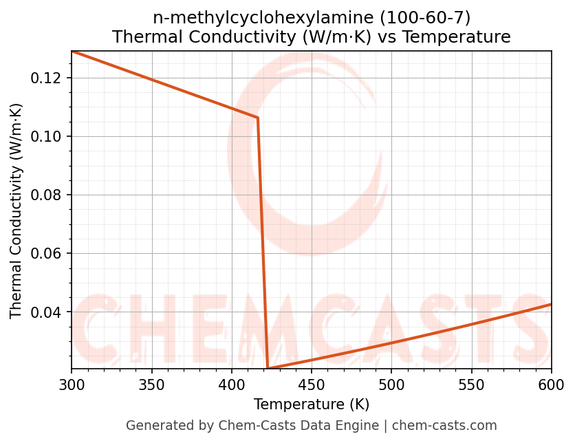 This page presents the temperature-dependent thermodynamic and transport properties of n-methylcyclohexylamine (CAS 100-60-7) calculated at a constant pressure of 1 atm (101325 Pa) over the temperature range 250-500 K.