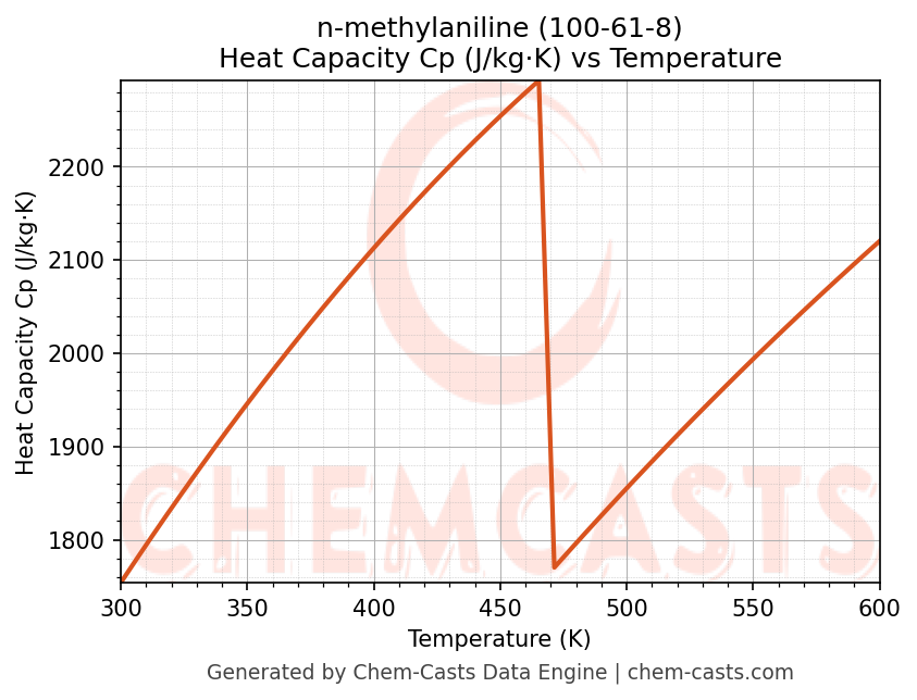 - Specific heat capacity (Cp) indicates the amount of energy required to raise the temperature of n-methylaniline and is critical for energy balance and heat-exchanger design.