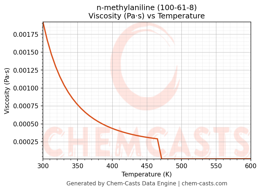 This page presents the temperature-dependent thermodynamic and transport properties of n-methylaniline (CAS 100-61-8) calculated at a constant pressure of 1 atm (101325 Pa) over the temperature range 250-500 K.