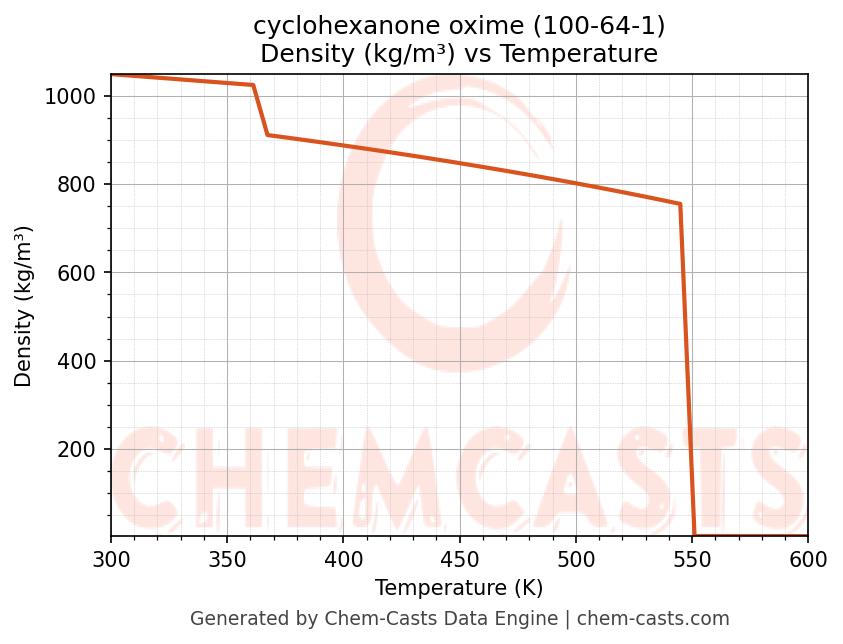 This page presents the temperature-dependent thermodynamic and transport properties of cyclohexanone oxime (CAS 100-64-1) calculated at a constant pressure of 1 atm (101325 Pa) over the temperature range 250-500 K.