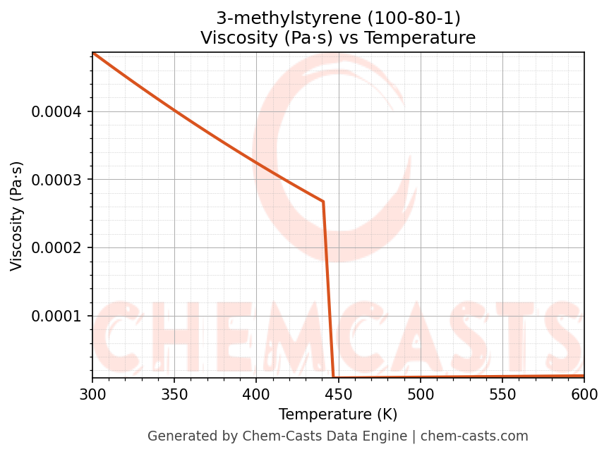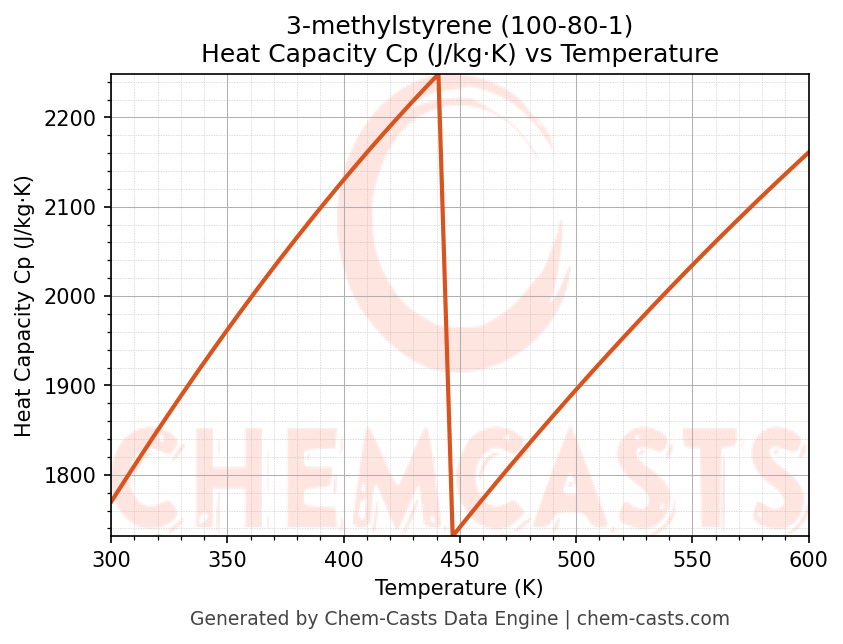 - Specific heat capacity (Cp) indicates the amount of energy required to raise the temperature of 3-methylstyrene and is critical for energy balance and heat-exchanger design.