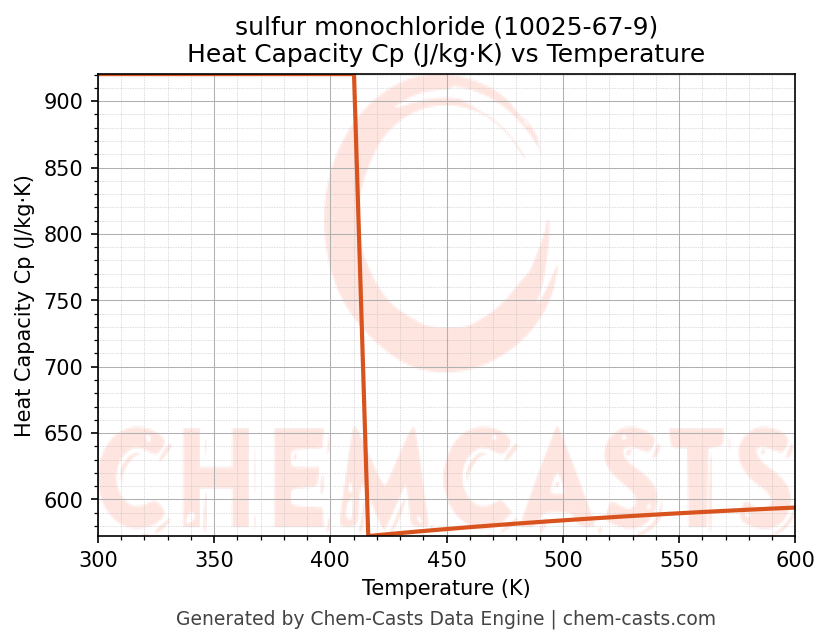 - Specific heat capacity (Cp) indicates the amount of energy required to raise the temperature of sulfur monochloride and is critical for energy balance and heat-exchanger design.