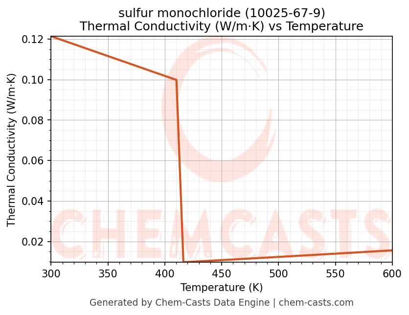 This page presents the temperature-dependent thermodynamic and transport properties of sulfur monochloride (CAS 10025-67-9) calculated at a constant pressure of 1 atm (101325 Pa) over the temperature range 250-500 K.