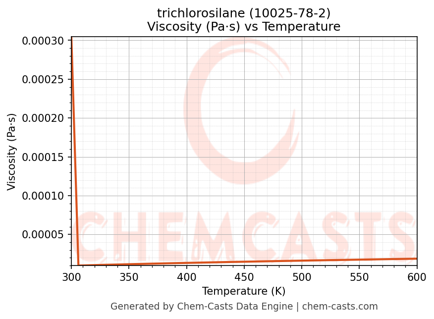 This page presents the temperature-dependent thermodynamic and transport properties of trichlorosilane (CAS 10025-78-2) calculated at a constant pressure of 1 atm (101325 Pa) over the temperature range 250-500 K.