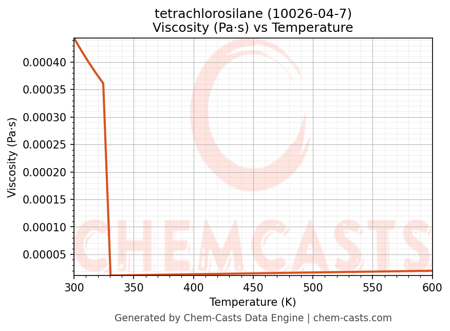 This page presents the temperature-dependent thermodynamic and transport properties of tetrachlorosilane (CAS 10026-04-7) calculated at a constant pressure of 1 atm (101325 Pa) over the temperature range 250-500 K.