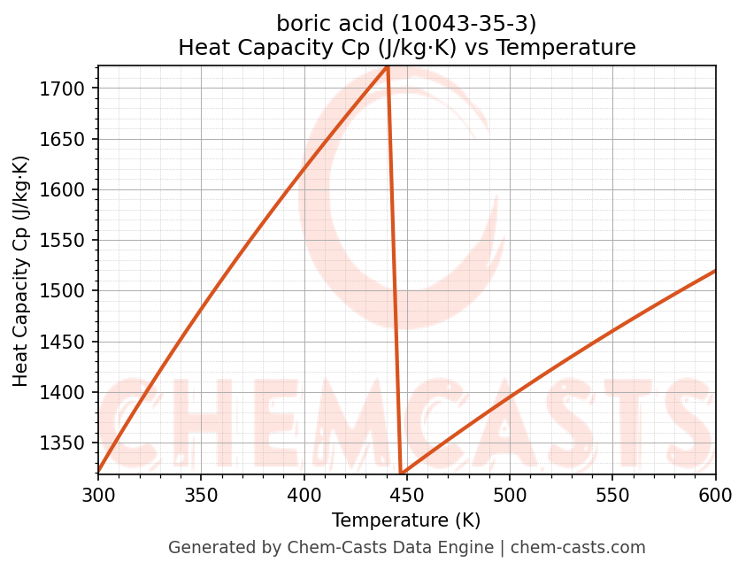 - Specific heat capacity (Cp) indicates the amount of energy required to raise the temperature of boric acid and is critical for energy balance and heat-exchanger design.