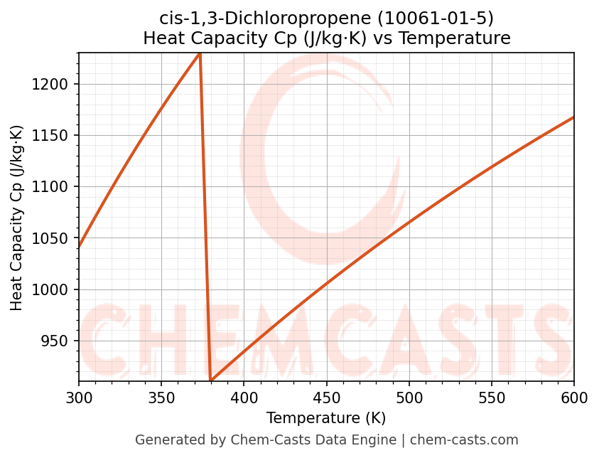 - Specific heat capacity (Cp) indicates the amount of energy required to raise the temperature of cis-1,3-Dichloropropene and is critical for energy balance and heat-exchanger design.