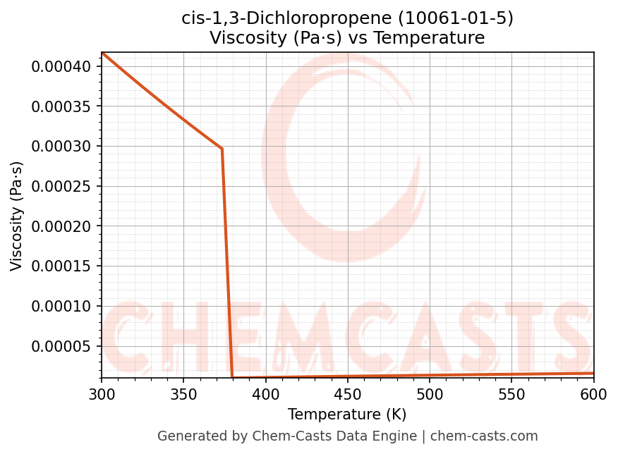 This page presents the temperature-dependent thermodynamic and transport properties of cis-1,3-Dichloropropene (CAS 10061-01-5) calculated at a constant pressure of 1 atm (101325 Pa) over the temperature range 250-500 K.