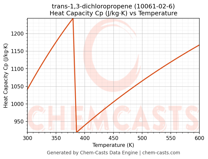 - Specific heat capacity (Cp) indicates the amount of energy required to raise the temperature of trans-1,3-dichloropropene and is critical for energy balance and heat-exchanger design.