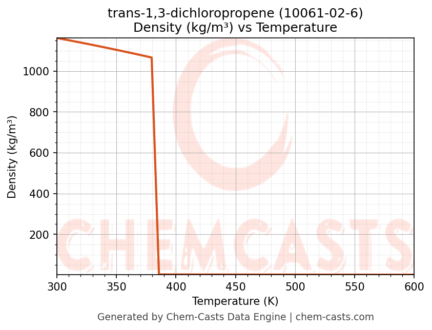 This page presents the temperature-dependent thermodynamic and transport properties of trans-1,3-dichloropropene (CAS 10061-02-6) calculated at a constant pressure of 1 atm (101325 Pa) over the temperature range 250-500 K.