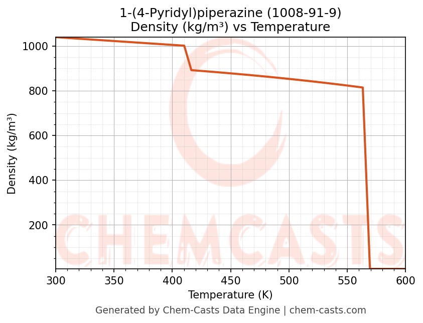 This page presents the temperature-dependent thermodynamic and transport properties of 1-(4-Pyridyl)piperazine (CAS 1008-91-9) calculated at a constant pressure of 1 atm (101325 Pa) over the temperature range 250-500 K.