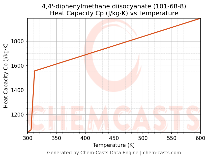 - Specific heat capacity (Cp) indicates the amount of energy required to raise the temperature of 4,4'-diphenylmethane diisocyanate and is critical for energy balance and heat-exchanger design.