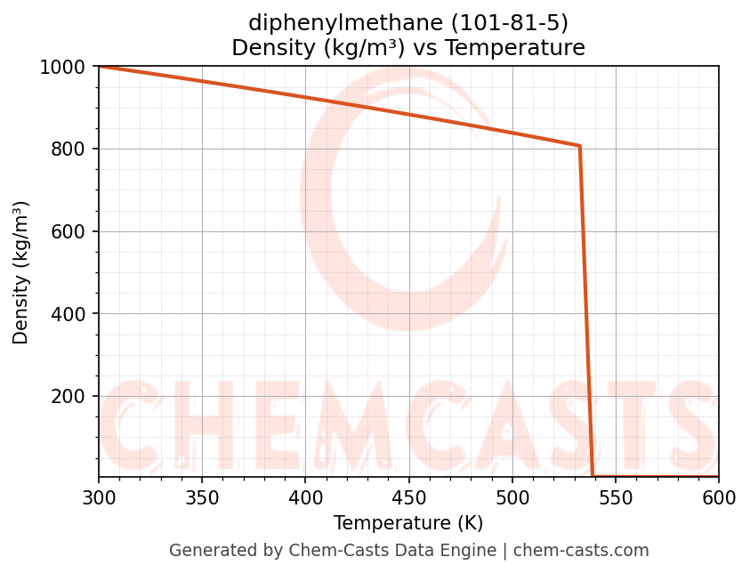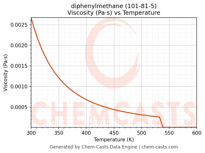 This page presents the temperature-dependent thermodynamic and transport properties of diphenylmethane (CAS 101-81-5) calculated at a constant pressure of 1 atm (101325 Pa) over the temperature range 250-500 K.