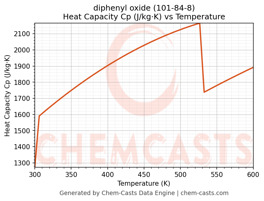 - Specific heat capacity (Cp) indicates the amount of energy required to raise the temperature of diphenyl oxide and is critical for energy balance and heat-exchanger design.