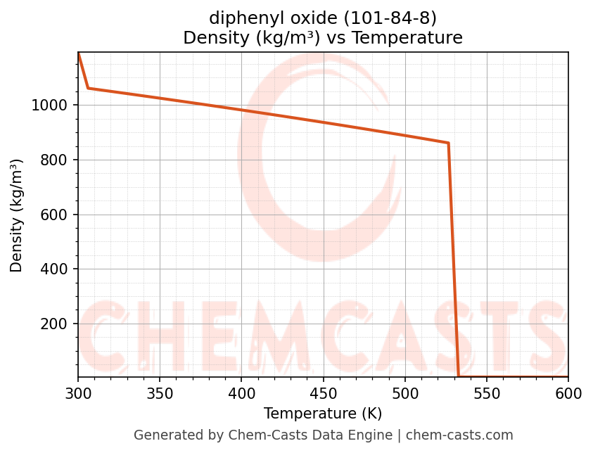 This page presents the temperature-dependent thermodynamic and transport properties of diphenyl oxide (CAS 101-84-8) calculated at a constant pressure of 1 atm (101325 Pa) over the temperature range 250-500 K.