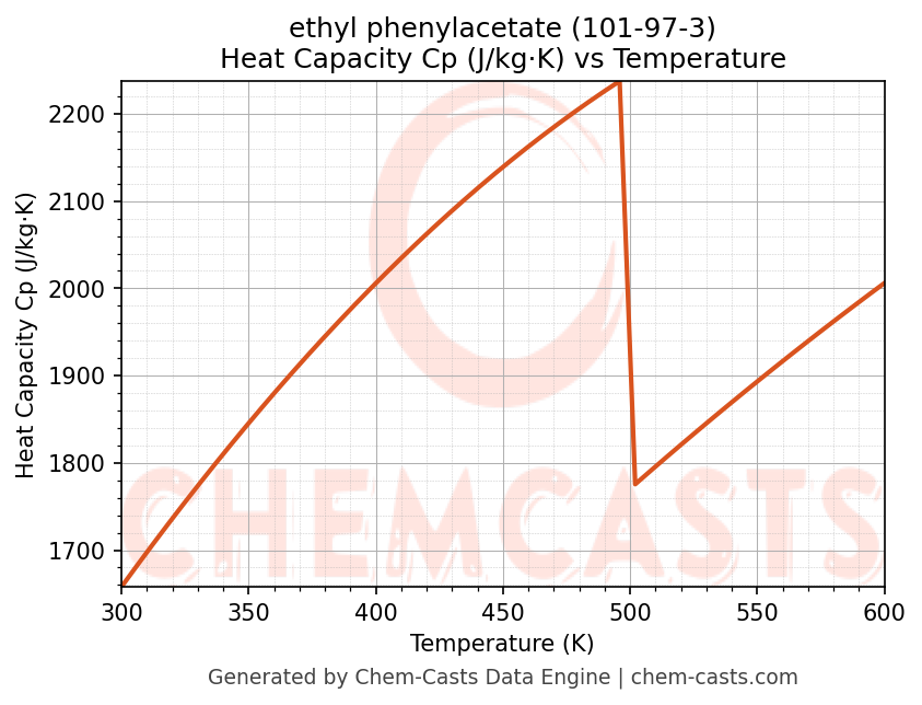 - Specific heat capacity (Cp) indicates the amount of energy required to raise the temperature of ethyl phenylacetate and is critical for energy balance and heat-exchanger design.