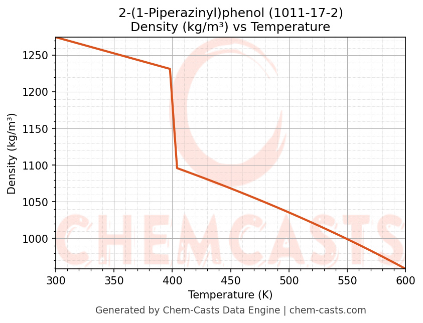 This page presents the temperature-dependent thermodynamic and transport properties of 2-(1-Piperazinyl)phenol (CAS 1011-17-2) calculated at a constant pressure of 1 atm (101325 Pa) over the temperature range 250-500 K.