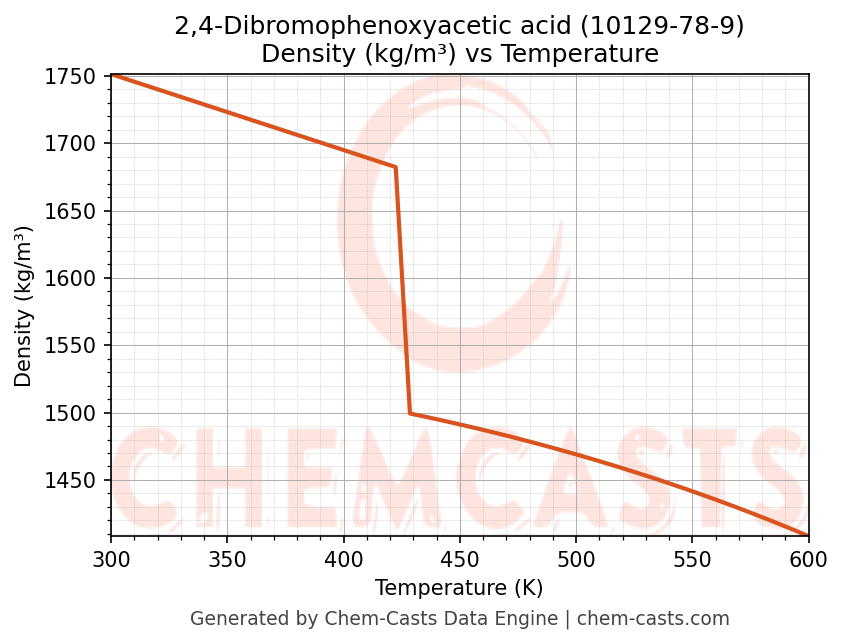 This page presents the temperature-dependent thermodynamic and transport properties of 2,4-Dibromophenoxyacetic acid (CAS 10129-78-9) calculated at a constant pressure of 1 atm (101325 Pa) over the temperature range 250-500 K.