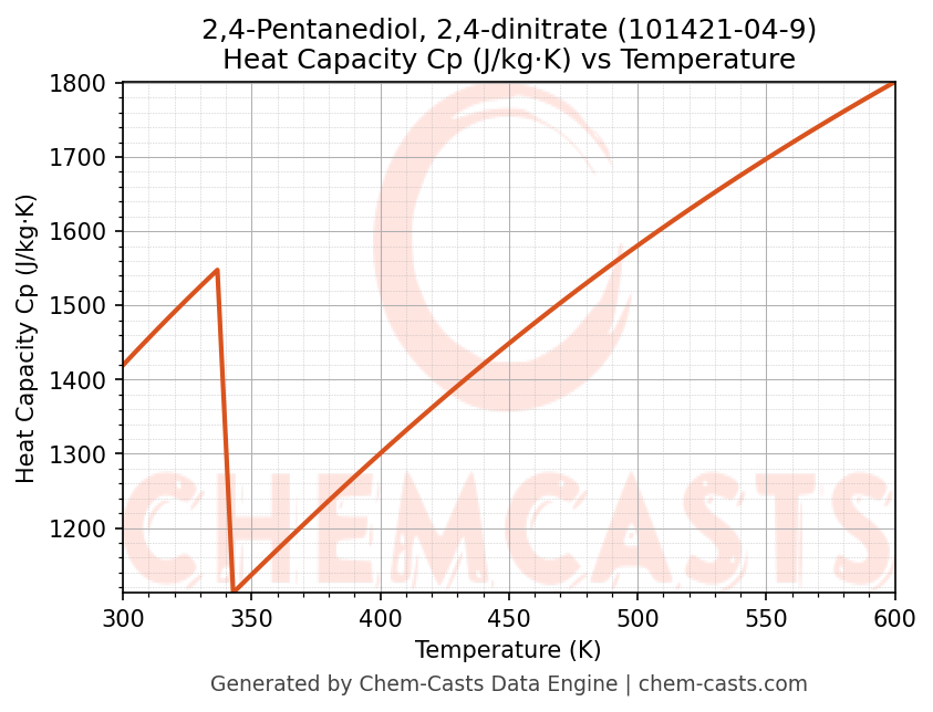 - Specific heat capacity (Cp) indicates the amount of energy required to raise the temperature of 2,4-Pentanediol, 2,4-dinitrate and is critical for energy balance and heat-exchanger design.
