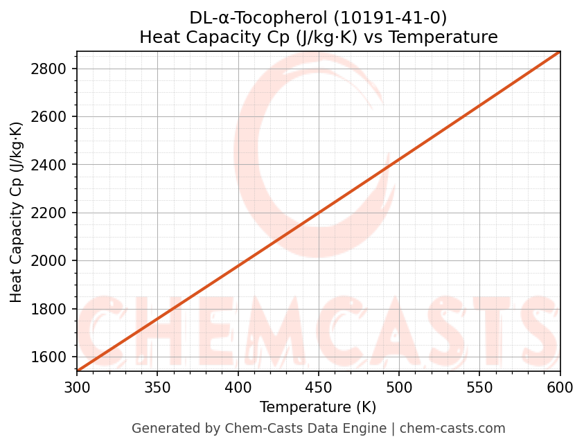 - Specific heat capacity (Cp) indicates the amount of energy required to raise the temperature of DL-α-Tocopherol and is critical for energy balance and heat-exchanger design.