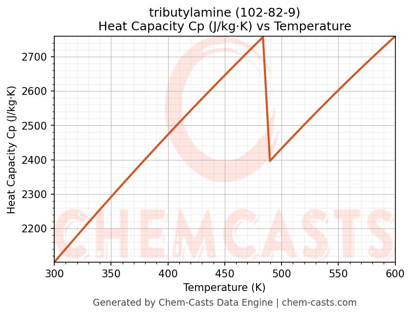 - Specific heat capacity (Cp) indicates the amount of energy required to raise the temperature of tributylamine and is critical for energy balance and heat-exchanger design.