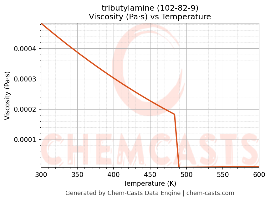 This page presents the temperature-dependent thermodynamic and transport properties of tributylamine (CAS 102-82-9) calculated at a constant pressure of 1 atm (101325 Pa) over the temperature range 250-500 K.
