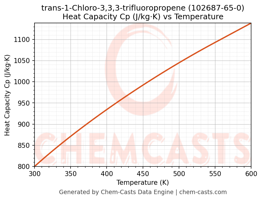 - Specific heat capacity (Cp) indicates the amount of energy required to raise the temperature of trans-1-Chloro-3,3,3-trifluoropropene and is critical for energy balance and heat-exchanger design.