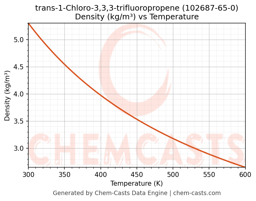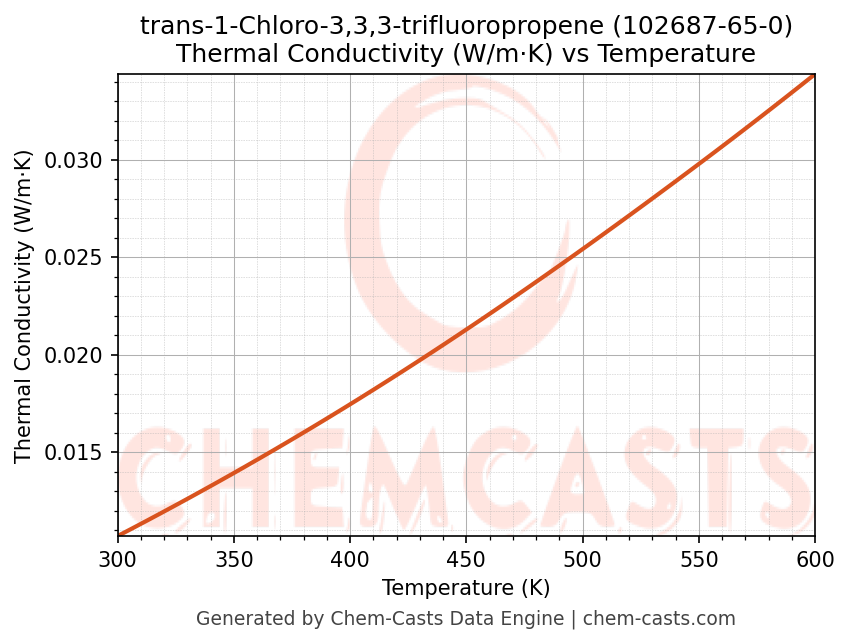 This page presents the temperature-dependent thermodynamic and transport properties of trans-1-Chloro-3,3,3-trifluoropropene (CAS 102687-65-0) calculated at a constant pressure of 1 atm (101325 Pa) over the temperature range 250-500 K.