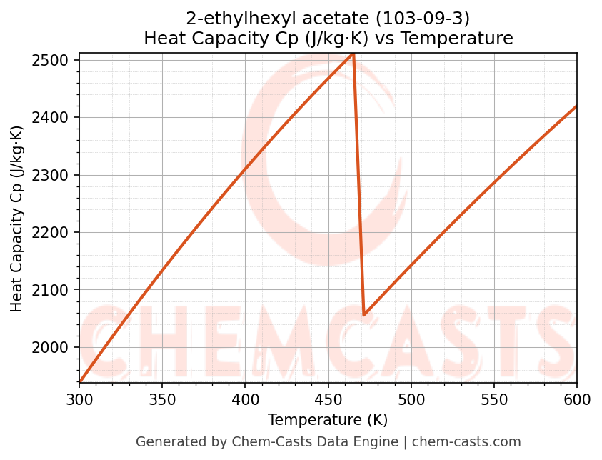 This page presents the temperature-dependent thermodynamic and transport properties of 2-ethylhexyl acetate (CAS 103-09-3) calculated at a constant pressure of 1 atm (101325 Pa) over the temperature range 250-500 K.