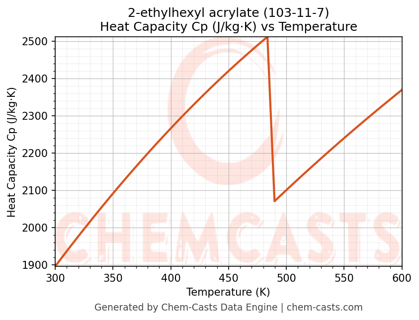 - Specific heat capacity (Cp) indicates the amount of energy required to raise the temperature of 2-ethylhexyl acrylate and is critical for energy balance and heat-exchanger design.