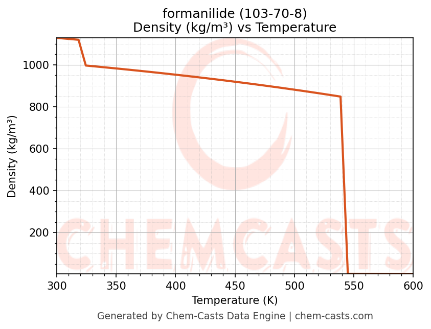 This page presents the temperature-dependent thermodynamic and transport properties of formanilide (CAS 103-70-8) calculated at a constant pressure of 1 atm (101325 Pa) over the temperature range 250-500 K.