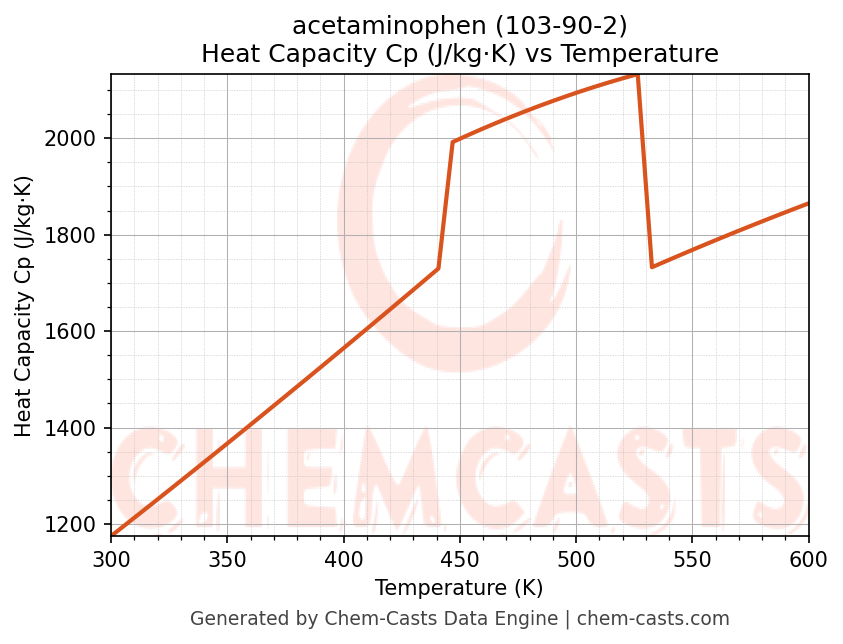 - Specific heat capacity (Cp) indicates the amount of energy required to raise the temperature of acetaminophen and is critical for energy balance and heat-exchanger design.