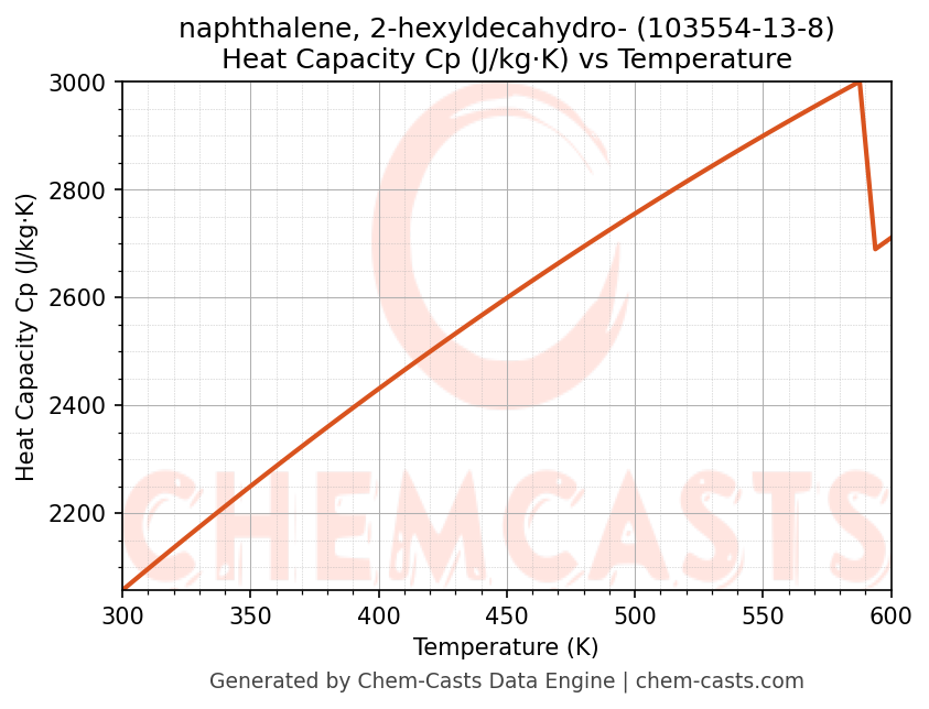 - Specific heat capacity (Cp) indicates the amount of energy required to raise the temperature of naphthalene, 2-hexyldecahydro- and is critical for energy balance and heat-exchanger design.