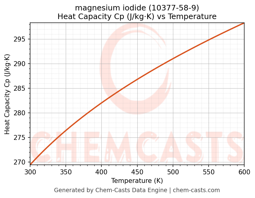 - Specific heat capacity (Cp) indicates the amount of energy required to raise the temperature of magnesium iodide and is critical for energy balance and heat-exchanger design.