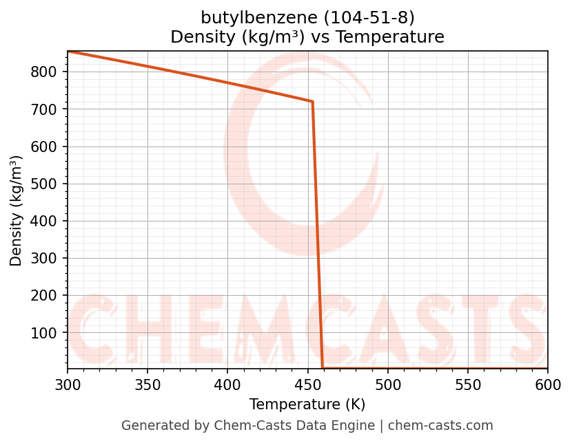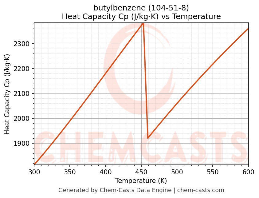 - Specific heat capacity (Cp) indicates the amount of energy required to raise the temperature of butylbenzene and is critical for energy balance and heat-exchanger design.