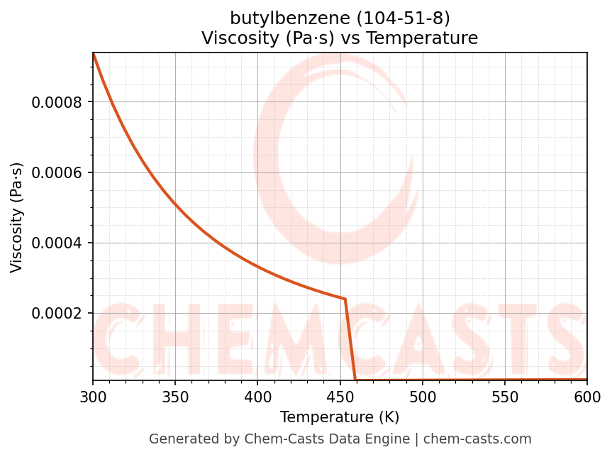 This page presents the temperature-dependent thermodynamic and transport properties of butylbenzene (CAS 104-51-8) calculated at a constant pressure of 1 atm (101325 Pa) over the temperature range 250-500 K.
