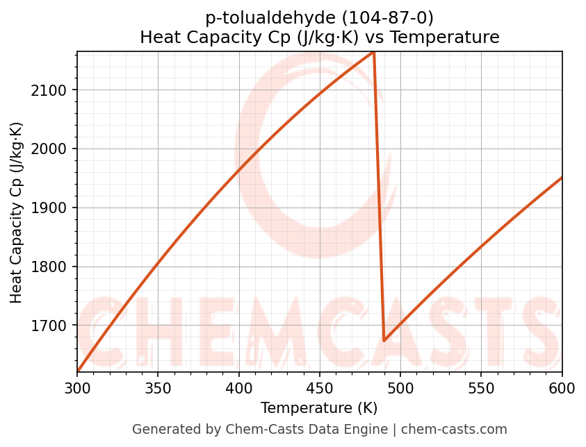 - Specific heat capacity (Cp) indicates the amount of energy required to raise the temperature of p-tolualdehyde and is critical for energy balance and heat-exchanger design.