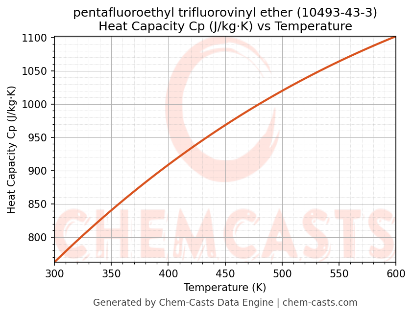 - Specific heat capacity (Cp) indicates the amount of energy required to raise the temperature of pentafluoroethyl trifluorovinyl ether and is critical for energy balance and heat-exchanger design.