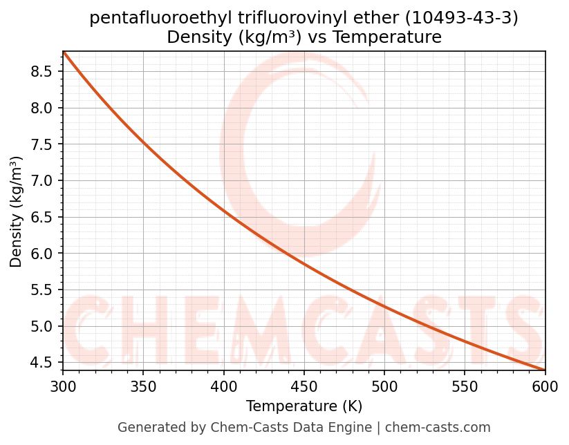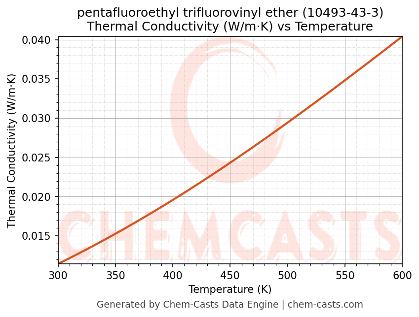 This page presents the temperature-dependent thermodynamic and transport properties of pentafluoroethyl trifluorovinyl ether (CAS 10493-43-3) calculated at a constant pressure of 1 atm (101325 Pa) over the temperature range 250-500 K.
