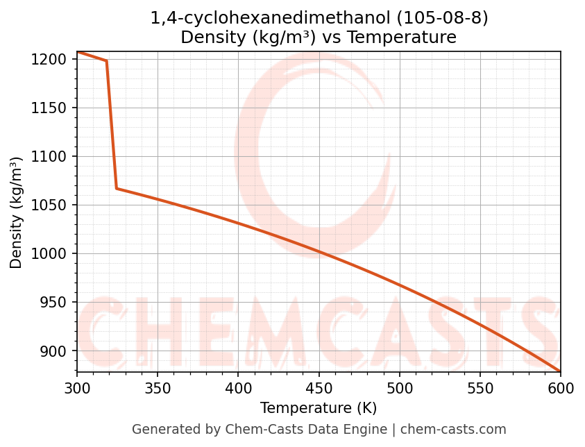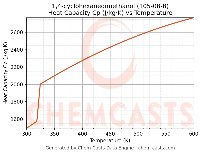 - Specific heat capacity (Cp) indicates the amount of energy required to raise the temperature of 1,4-cyclohexanedimethanol and is critical for energy balance and heat-exchanger design.